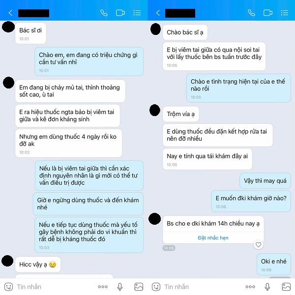 • Chị Đ.T.V (35 tuổi, ù tai kèm nghe kém): “Ban đầu tôi rất lo vì tai ù liên tục, nghe không rõ. Nhờ được bác sĩ tư vấn và điều trị đúng cách, tình trạng ù tai giảm nhiều, khả năng nghe tốt hơn.”