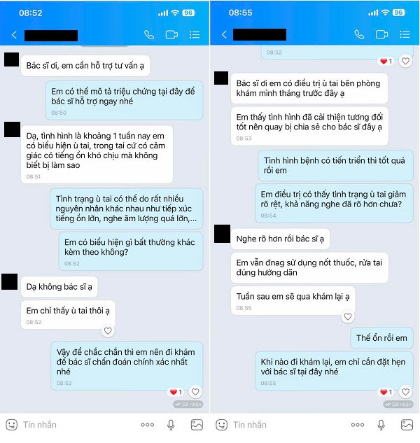- Anh N.V.H (39 tuổi, Bắc Ninh): “Tôi thường xuyên bị đau tai, ù tai và nghe kém. Khi đến phòng khám, bác sĩ thăm khám rất kỹ, nội soi tai cẩn thận và giải thích rõ tình trạng bệnh. Sau điều trị, các triệu chứng giảm rõ rệt, tai dễ chịu hơn.”